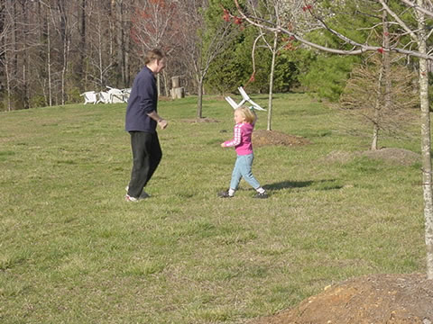 Anna is chasing Uncle Chris. It looks like she is getting ready to throw something at him, but it is a chair in the distance.