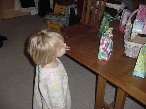 Anna inspecting what the Easter Bunny left for her.